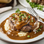 Hamburger steak with brown gravy is a flavorful dish made from ground beef patties served with rich gravy.