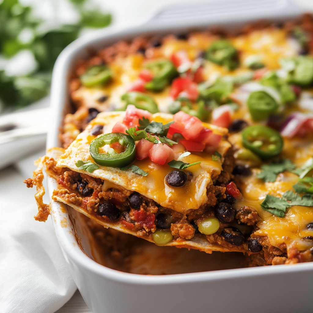 Experience the irresistible flavors of a Taco Bake Casserole with Tortillas! This comforting dish features layers of crispy tortillas, seasoned ground beef, black beans, and gooey cheese, all topped with fresh veggies. Perfect for family dinners or casual gatherings, it’s a crowd-pleaser that brings everyone together. Easy to prepare and delightful to serve, this casserole will soon become a favorite in your household!